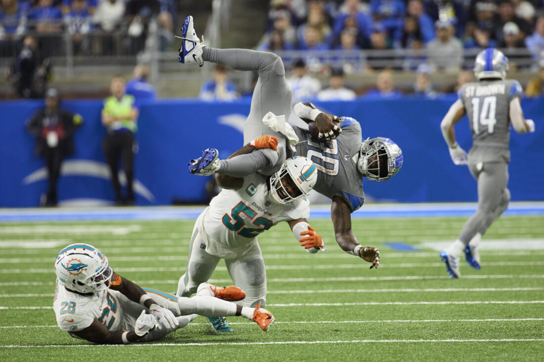 - Miami Dolphins linebacker Elandon Roberts (52) tackles Detroit Lions running back Jamaal Williams (30) during an NFL football game, Sunday, Oct. 30, 2022, in Detroit. (AP Photo/Rick Osentoski)