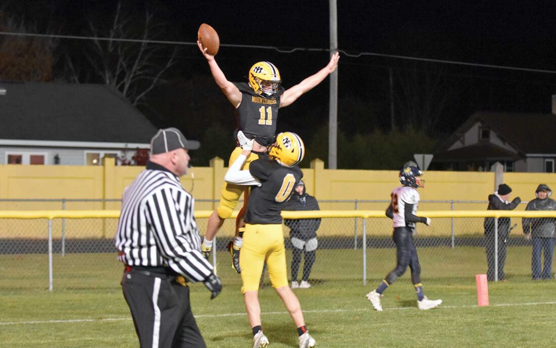 The Iron Mountain varsity football team will keep on playing, after beating Bark River-Harris 32-16 in the MHSAA’s Division 8 11-player district final Friday at Mountaineer Stadium. Pictured, Mountaineer Oskar Kangas (0) lifts up teammate Luke Wolfe (11) after Wolfe scored a touchdown in the first half against the visiting Broncos. Iron Mountain led 25-8 at halftime. (Dennis Mansfield/Daily News photo)