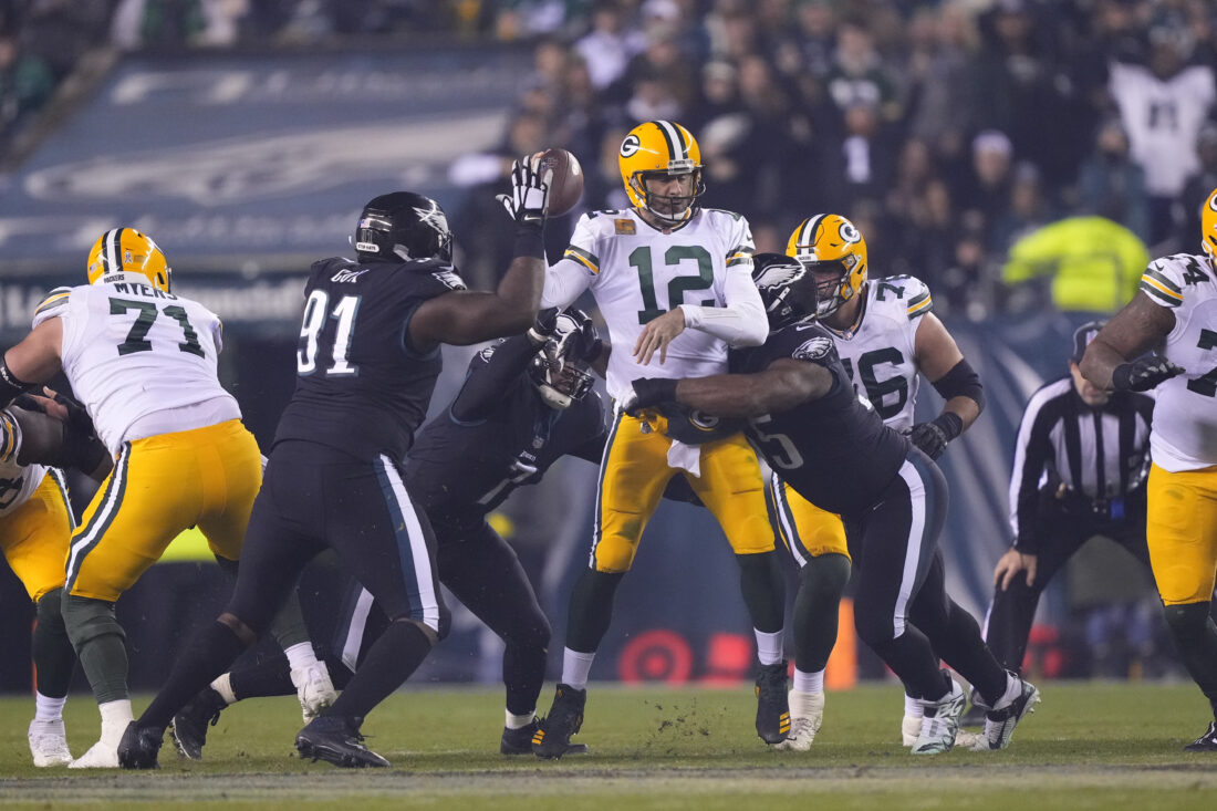 Green Bay Packers quarterback Aaron Rodgers (12) is hit during the second half of an NFL football game against the Philadelphia Eagles, Sunday, Nov. 27, 2022, in Philadelphia. (AP Photo/Matt Rourke)