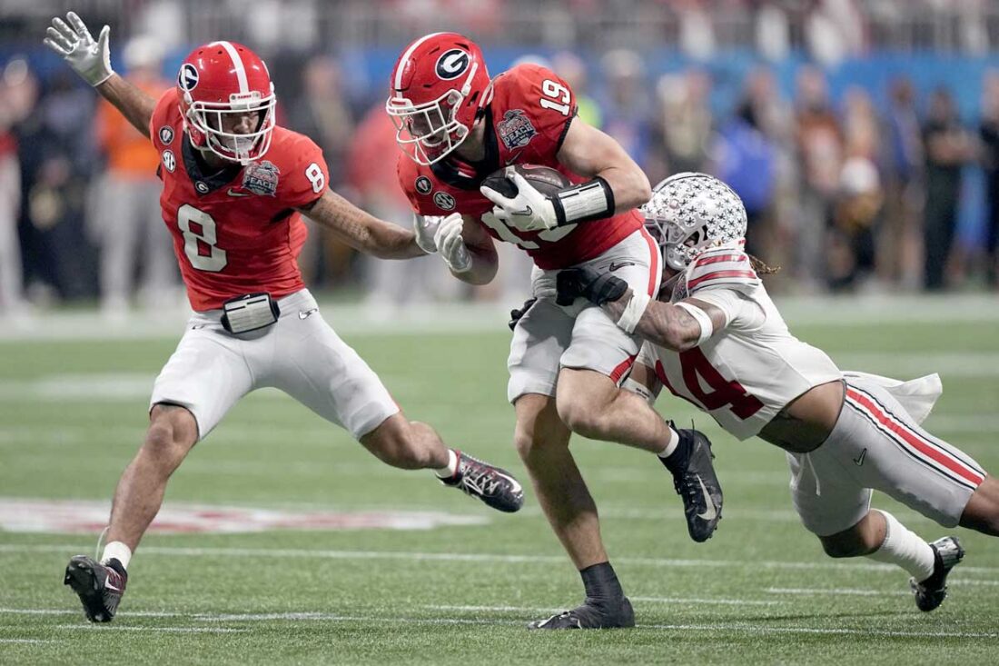 Ohio State safety Ronnie Hickman (14) hits Georgia tight end Brock Bowers (19) during the second half of the Peach Bowl NCAA college football semifinal playoff game Dec. 31, 2022, in Atlanta. (Brynn Anderson/AP photo)