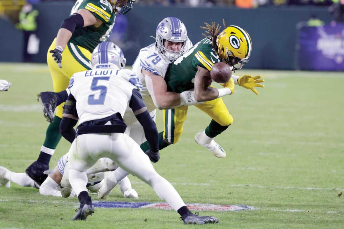 Green Bay Packers running back Aaron Jones fumbles as he is hit by Detroit Lions defensive end John Cominsky (79) during the first half of Sunday night’s regular-season finale in Green Bay, Wis. The Lions recovered the fumble and won the NFC North clash, 20-16, eliminating the Packers (8-9) from a potential playoff berth. (Mike Roemer/AP photo)
