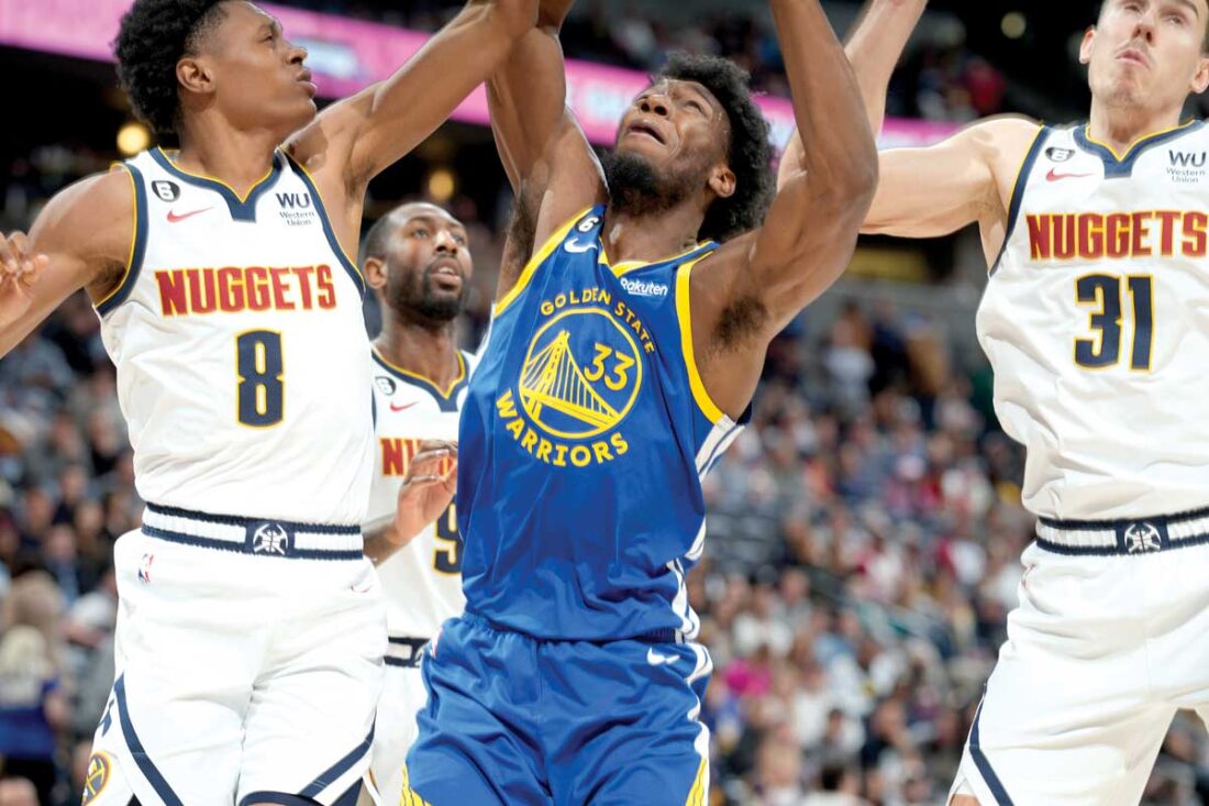 Golden State Warriors center James Wiseman (33) fights for a rebound with Denver Nuggets forward Peyton Watson (8) and Denver Nuggets forward Vlatko Cancar (31) in the second half of the Feb. 2 game in Denver. Wiseman, the No. 2 pick overall in the 2020 draft, was traded to the Detroit Pistons on Thursday as part of a four-team trade before the NBA’s trade deadline. (David Zalubowski/AP photo)