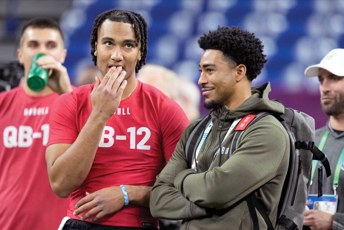- Ohio State quarterback CJ Stroud (left) talks to Alabama quarterback Bryce Young at the NFL football scouting combine in Indianapolis on Saturday. The two quarterbacks are both projected to be top 10 picks in next month’s NFL Draft. (Darron Cummings/AP photo)