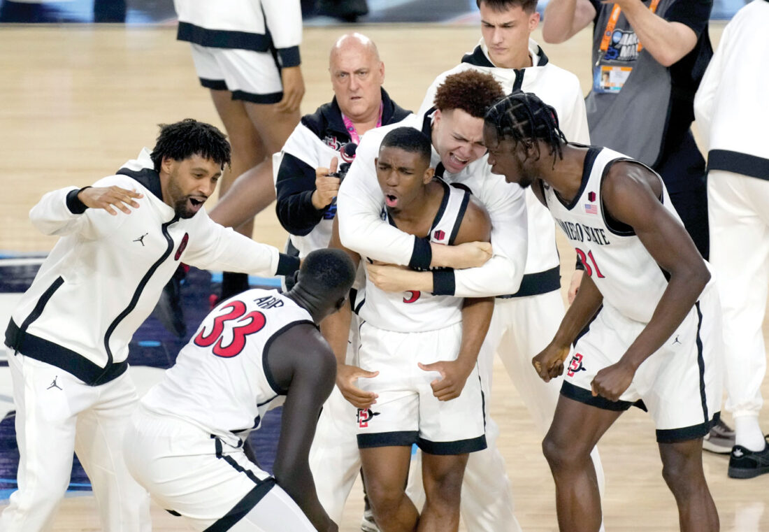 San Diego State guard Lamont Butler (center) celebrates with teammates after he hit the winning basket against Florida Atlantic during the second half of a Final Four college basketball game in the NCAA Tournament on Saturday in Houston. (Godofredo A. Vasquez/AP photo)