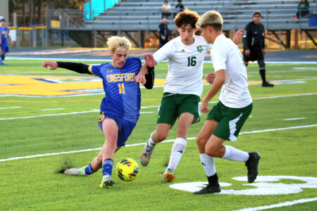 - Kingsford’s Jonah Nelson (11) fights for control as he’s pressured Wednesday by Grayling’s Francesco Rainone (16) and Jackson Marshall (6) in an MHSAA Division 3 district semifinal match at Flivver Field. Kingsford won 4-1. (Terry Raiche photos)