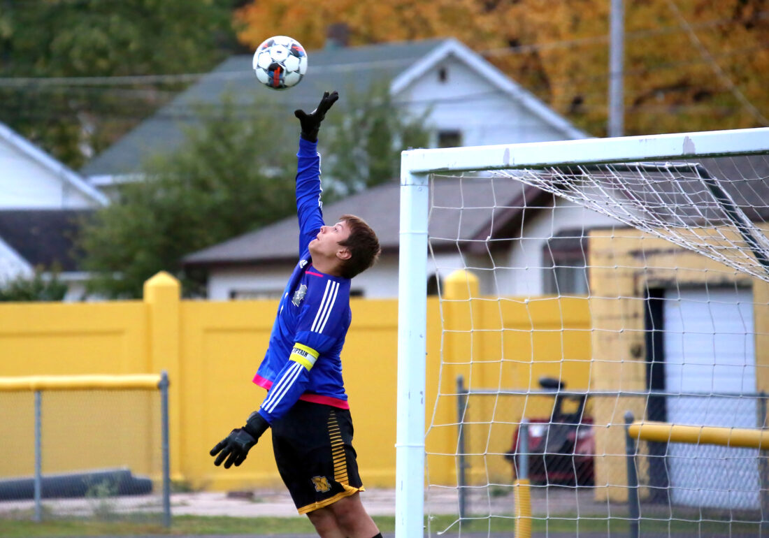 Iron Mountain goalie Austin Gayan leaps and swats the ball over the top of the goal post for a save in soccer action against Three Lakes, Wis., on Monday at Mountaineer Stadium. The Mountaineers travel to Elk Rapids on Saturday for an MHSAA Division 3 first round game in District 33. Kingsford, meanwhile, hosts Kalkaska at 4 p.m. today, also in District 33. (Terry Raiche photo)