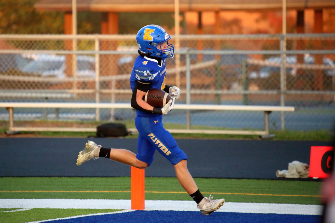 Kingsford’s Sid Olson (4) sprints into the end zone for a touchdown at Flivver Field during a 41-0 win against Hancock on Oct. 3. The Flivvers host undefeated Menominee on Friday. (Terry Raiche photo)