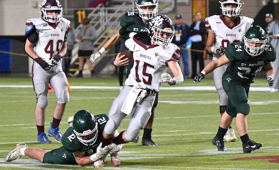 The Nordics drove into St. Patrick territory twice in the period. The first stalled at the 44 when the game was still within reach at 26-0. The second got all the way to the 24, but incomplete passes on third and fourth downs gave St. Patrick the ball back with four seconds on the first-half clock.
