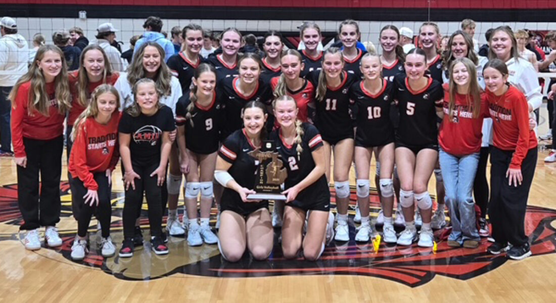 Forest Park captains Ava Fischer, left and Elsie Williams hold the district championship trophy after 3-0 win Thursday over Wakefield-Marenisco. (Courtesy photo)