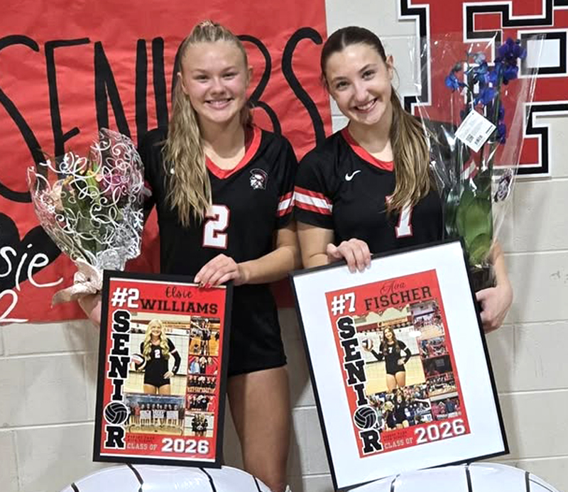Volleyball captains Elsie Williams, left, and Ava Fischer receive honors during a Senior Night match at Forest Park High School on Oct. 30. Fischer is the Skyline Central Conference player of the year while Williams was named to the all-conference first team. (Courtesy photo)
