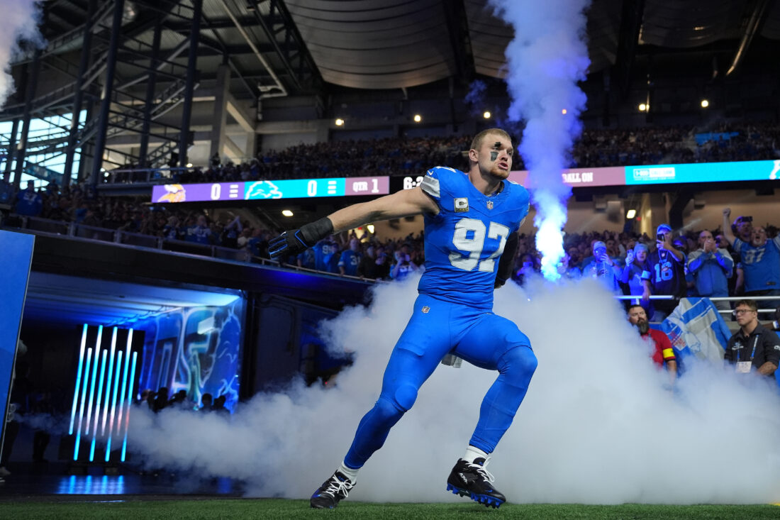 Detroit Lions defensive end Aidan Hutchinson (97) is introduced before an NFL football game against the Minnesota Vikings Sunday, Nov. 2, 2025, in Detroit. (AP Photo/Ryan Sun)
