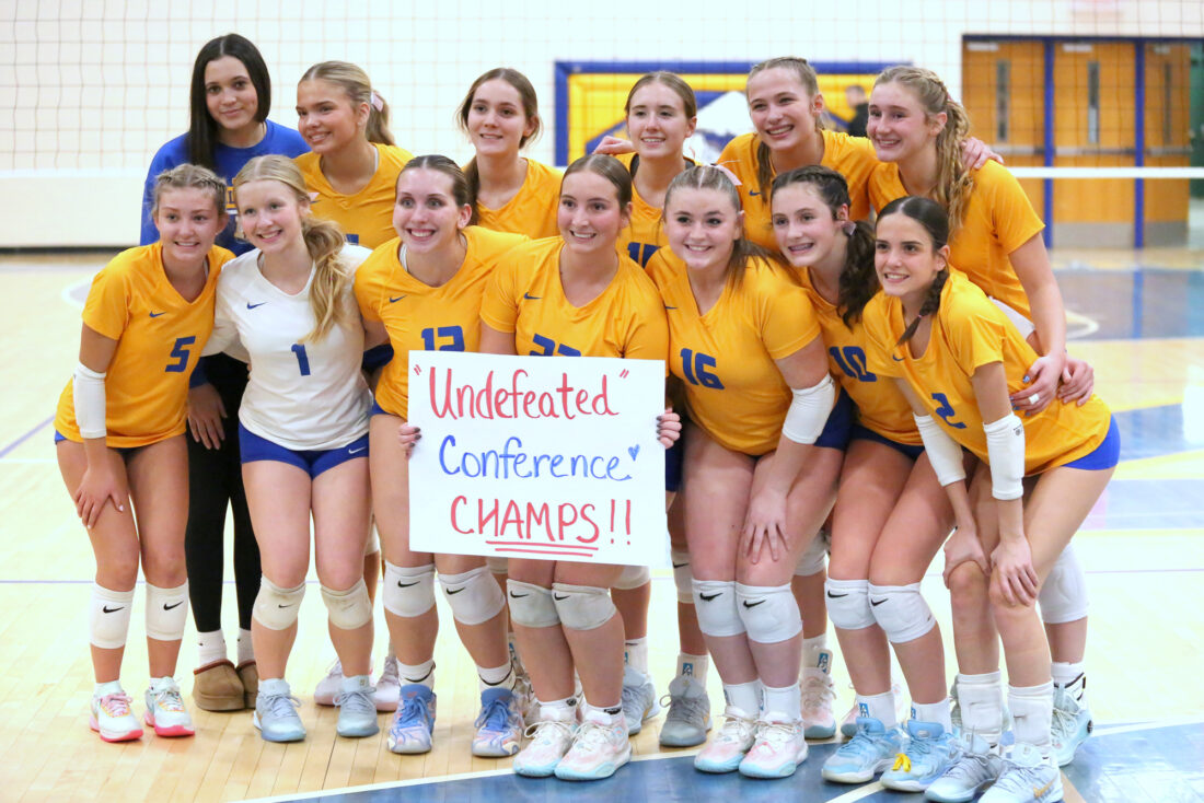 Kingsford collected its third straight undefeated GNC title with a 3-0 win over Marquette on Thursday. The Flivvers will enter the MHSAA Division 2 tournament tonight with a match at Houghton. From left, front, are Onika Smeester, Alivia Nash, Cassie Olson, Carly Trevillian, Adelyn Normand, Mckynzee Kreider and Lakyn Wallis; back, Zahra Wicks, Emma Strom, Alyvia Kowalski, Mya Brunswick, Staysha Jarski and Mylee Kreider. (Terry Raiche photo)