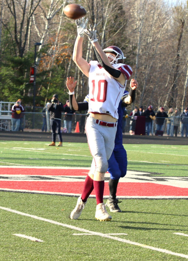 North Dickinson’s Trenton Kramer (10) reaches for a pass against Onekama during an MHSAA eight-player Division 2 state semifinal Saturday in Marquette. Kramer had 11 catches for 155 yards in the Nordics’ 36-28 win. (Dawn Larson photo)