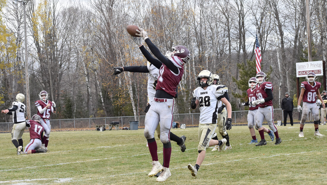 North Dickinson's Trenton Kramer (10) makes the catch from Nordic quarterback Brady Jungwirth (15) for a successful two-point conversion in Saturday's MSHAA Division 2 eight-player regional opener against St. Ignace at James D. Priestap Memorial Field in Felch Township. Watching in back are Nordic players Richard Haney (69), Andrew Larson (49) and Ty King (80). (Betsy Bloom/Daily News photo)