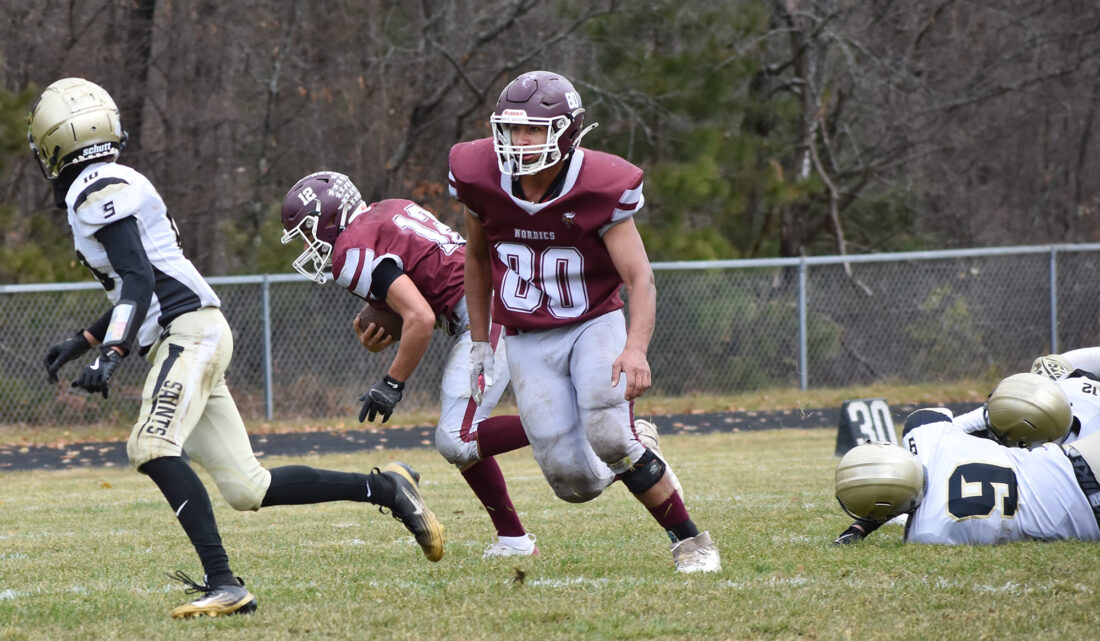 North Dickinson’s Ty King (80) blocks for Jason Graham (12) during the Nordics’ 40-22 win over St. Ignace at James D. Priestap Memorial Field on Saturday. North Dickinson (10-0) will host Lake Linden-Hubbell at noon Saturday in an MHSAA Division 2 regional final. (Betsy Bloom/Daily News photo)