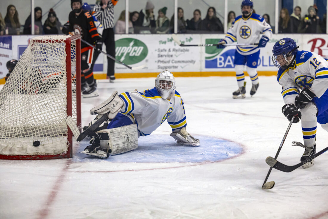 - Kingsford sophomore Alex Hemgren slides to deny an Escanaba shot during the second period of Tuesday’s Great Lakes Hockey Conference contest at Wells Sports Complex. (Ron Deuter photos)