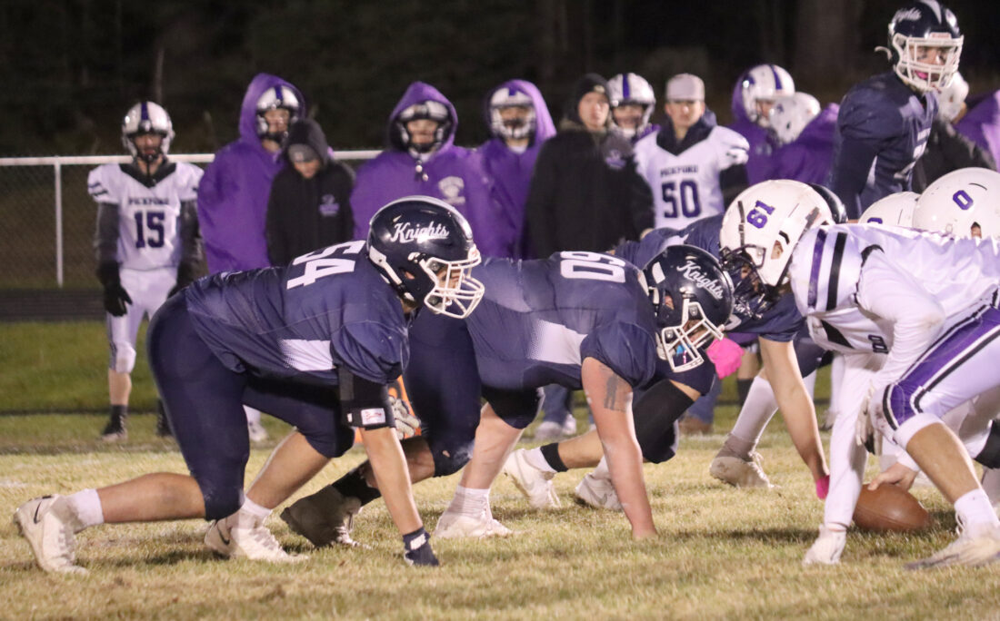 Norway’s Keith Burcar (54) and Chase Moraska (60) line up on defense against Pickford on Nov. 7 at Ronberg Field in Norway. (Mary Spera photo)