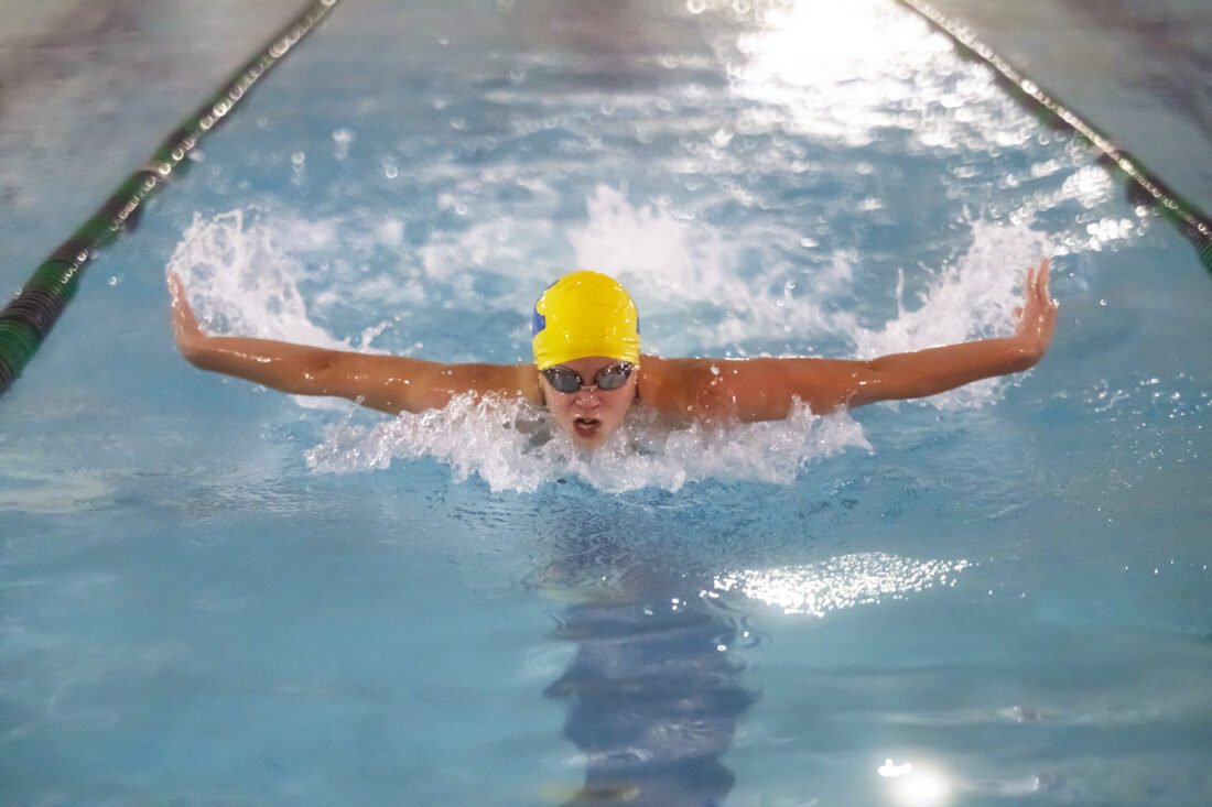 Iron Mountain Sophomore Bryce Johnson tops the field during the boys 100 butterfly during Tuesday’s meet against Houghton at the Northern Lights YMCA Dickinson Center pool. Johnson also took first in the 100 backstroke. (Ron Deuter photos)