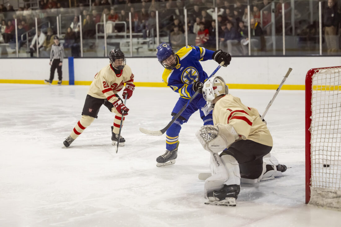 Leo Dose made it 3-0 at 9:32 of the second. Austin Lee added a shorthanded score during the five-minute major penalty with 10:25 to play in the game. Smith scored again with 3:04 to play.