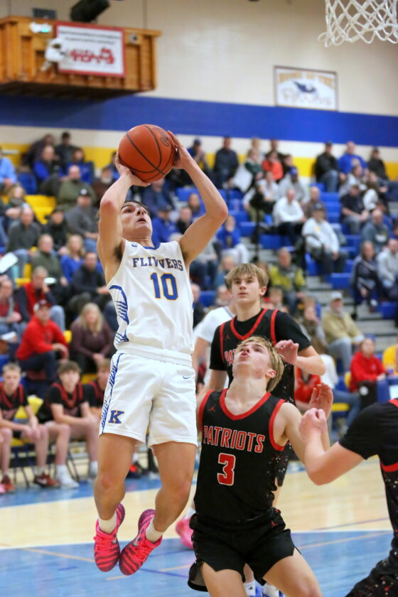 Kingsford’s Gaige Sorenson (10) puts up a baseline shot over Westwood’s Louis Salmi (3) on Monday at Kingsford. The Flivvers (2-1) fell to the Patriots 59-54 in the non-conference game. Westwood improved to 4-0. Kingsford travels to Negaunee on Thursday (Terry Raiche photo)