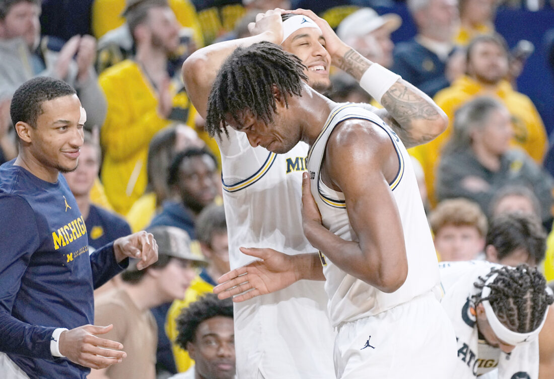 Michigan forward Morez Johnson Jr., front right, greets guard Nimari Burnett, left, and forward Yaxel Lendeborg, back right, on the bench during the second half of an NCAA college basketball game Friday against Southern California in Ann Arbor, Mich. (AP Photo/Ryan Sun)