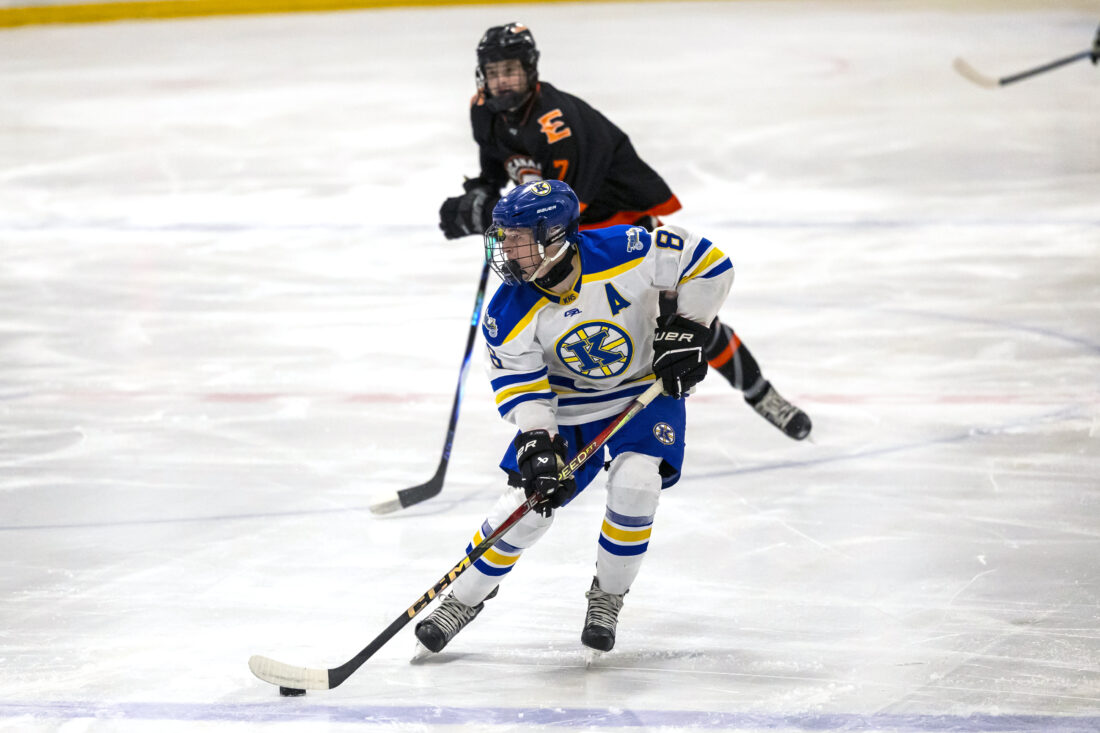 Kingsford senior Jake Deuter carries the puck into the offensive zone against Escanaba Tuesday evening at Mountain View Ice Arena. Deuter scored Kingsford’s only goal in a 7-1 loss, with an assist from senior captain Will Murvich. The state-ranked Eskymos scored five times in the first period to send the Flivvers to a third straight defeat. In what was a tough night all around for the Flivvers, the team suffered a major blow in the setback with the loss of senior goaltender Nate Scullon to a lower body injury. Kingsford hosts Hancock tonight at 5:30 and heads to Mosinee, Wis., on Friday. (Ron Deuter photo)
