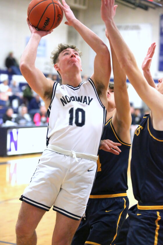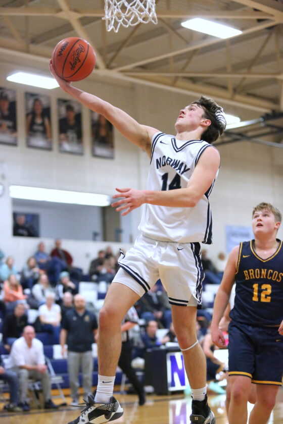 - Norway’s Kaleb LaPine (14) drives in for a fastbreak layup Monday as Andrew Johnson (12) of Bark River-Harris trails on the play at Norway High School. (Terry Raiche photos)