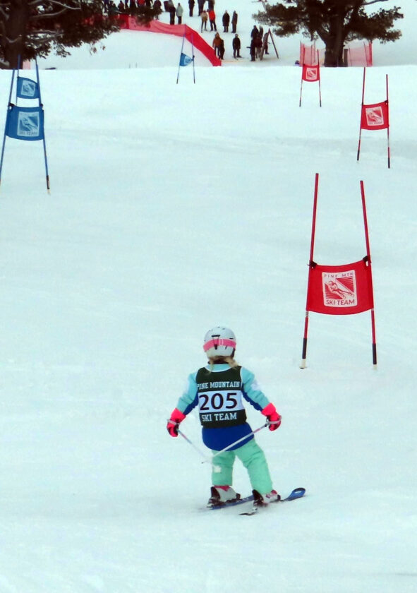 Pine Mountain Ski Team racer Basia Nowicki navigates the giant slalom course at Pine Mountain en route to earning a second-place finish in the Under 8 classification. Nowicki also finished third in the U8 slalom. (Courtesy photo)