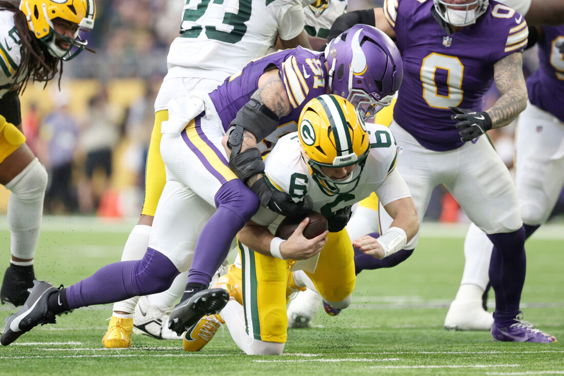 With Jordan Love safely watching on the sideline and Malik Willis recovering from injuries, the Packers gave Clayton Tune his second career start at quarterback and netted minus-7 passing yards. Dallas Turner had two of Minnesota’s four sacks that racked up 41 lost yards for Green Bay.