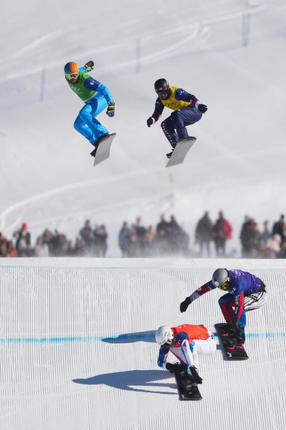 - Italy’s Lorenzo Sommariva (6-1), United States’ Nick Baumgartner (14-1), France’s Aidan Chollet (3-1) and Czechia’s Krystof Choura (11-1), compete during the mixed team snowboard cross finals at the 2026 Winter Olympics, in Livigno, Italy, Sunday, Feb. 15, 2026. (AP Photo/Lindsey Wasson)
