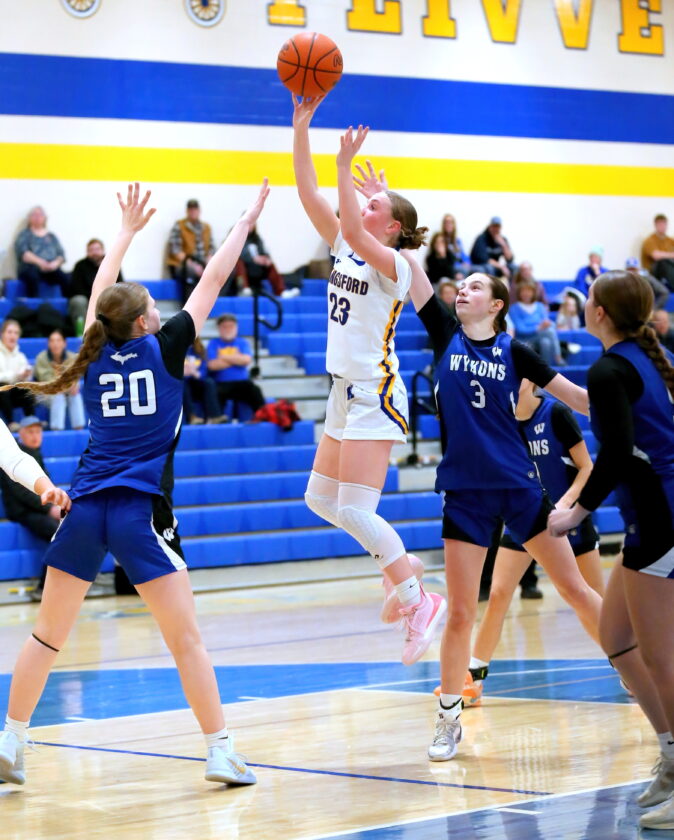 Kingsford's Avery Edwards (12) drives and puts up a one-handed shot between West Iron defenders Eriana Sucholl (20) and Bristol Shamion (3) on Tuesday at Flivver Gym. Kingsford won 45-30 to improve to 11-2 while the Wykons fell to 4-10. The Flivvers host Marquette tonight and will travel to Menominee on Monday. (Terry Raiche photo)