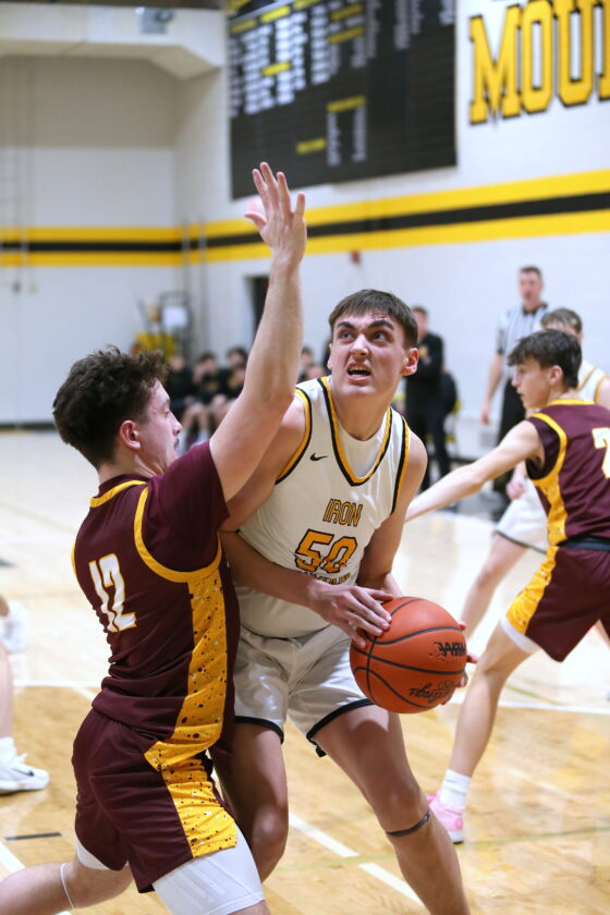 Iron Mountain's Charles Baldridge (50) looks to muscle up a shot over Menominee defender Nathan Komp (12) in a Feb. 2 game at Mountaineer Gym. Baldridge scored 22 points in a win at Gwinn on Friday. (Terry Raiche photo)