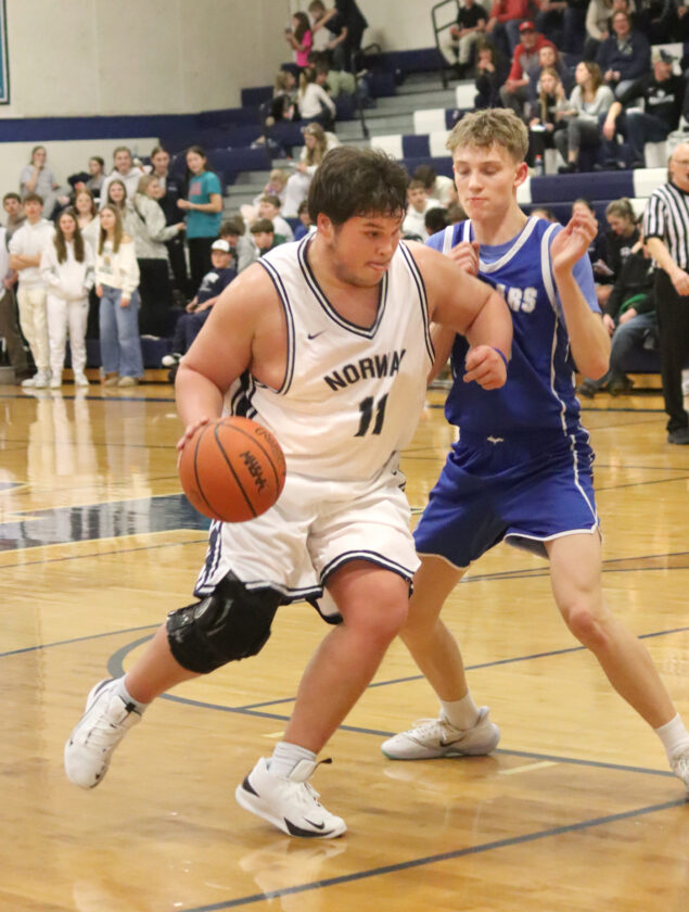 Norway Senior Maddex Burklund drives to the basket against Superior Central on Tuesday at Norway High School. The Knights wrapped up their regular season with an 82-35 win, led by Elliott Kraemer's 22 points and 20 from Anthony Pineda. Norway (13-9) now awaits the winner of the MHSAA Division 4 District 99 first-round game Monday between Stephenson and Hannahville Nah Tah Wahsh. The Knights will play their semifinal game on Wednesday in Norway. (Mary Spera photo)