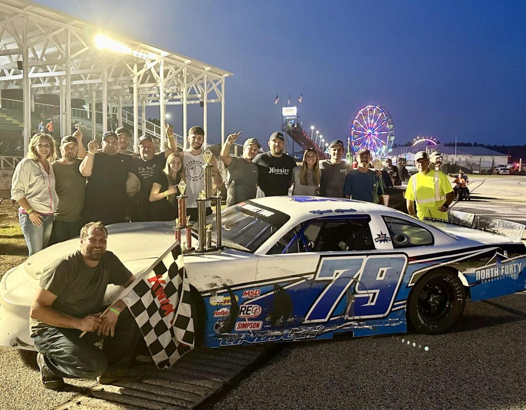 2025 Norway Speedway Fast 5 Coca-Cola Late Model champion No. 79 Dan Lindsley celebrates with his team. (Lia Olson photo, file)