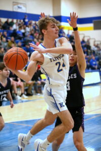 - Blake Tomasoski (24) of Kingsford drives baseline past Lonnie Davey (3) of Gladstone and fires a pass to a teammate Friday. (Terry Raiche photo)