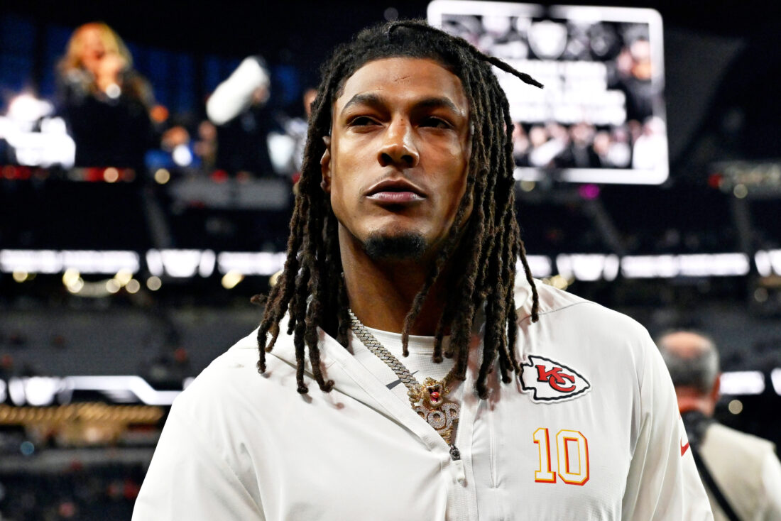 Kansas City Chiefs running back Isiah Pacheco (10) looks on after a game against the Las Vegas Raiders on Jan. 4 in Las Vegas. (AP Photo/David Becker, file)