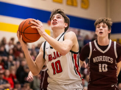 - Kingsford’s Jack Kriegl (4) puts up a jumper and scores over Menominee’s Dylan Beal (1) during a Feb. 17 game at Kingsford. (Terry Raiche photo)