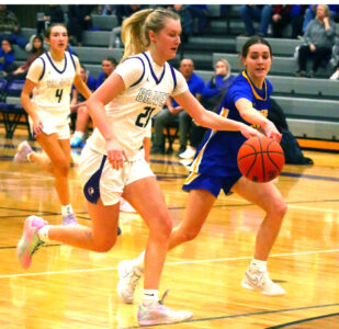 - Norway’s Lauren Adams (3) scores over Munising defender Olivia Cotey during a Jan. 26 game at Norway. (Terry Raiche photo)
