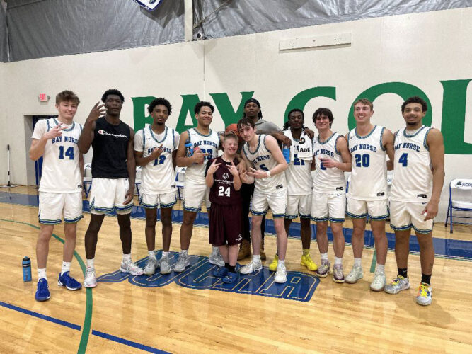 ESCANABA — The spirit of sportsmanship and community was on full display at the U.P. Regional Basketball Tournament on March 1 when Bay College Norse Basketball team members rushed the court to celebrate a thrilling moment for a dedicated Norse fan and Special Olympian, Scotty Bartley.