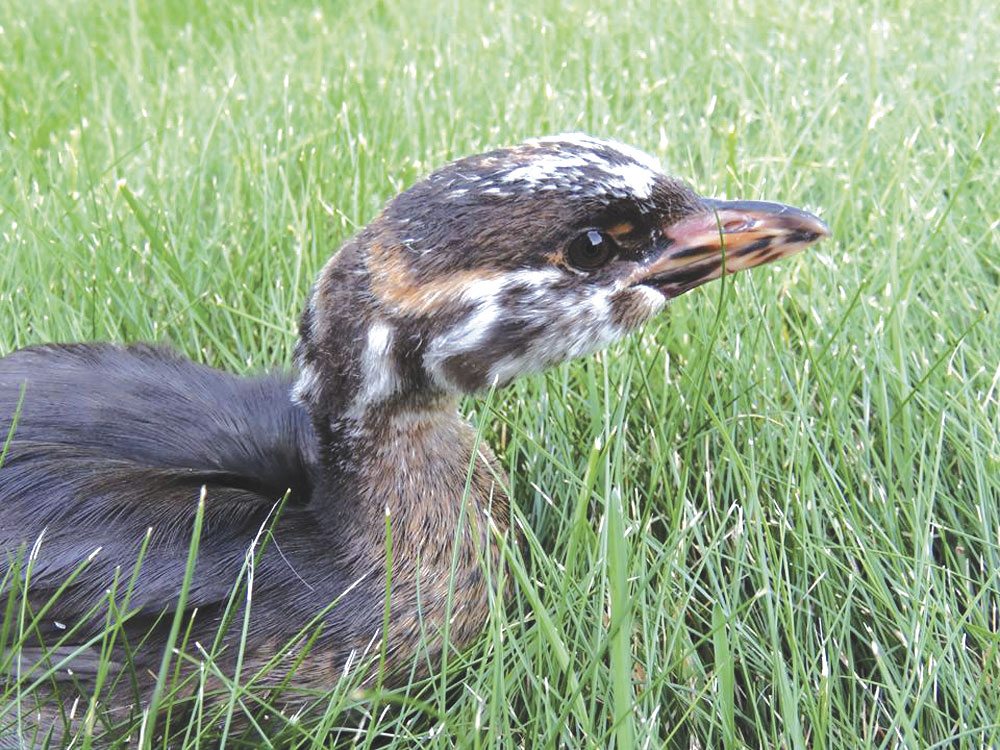 A young pied-billed grebe that likely mistook a wet road for a pool of water got a lift from wildlife rehabilitator Phyllis Carlson to much better conditions for this diving species at Crystal Lake. Only the juvenile birds have these “skunk heads;” adults are light brown with a striped bill, hence the name. (Phyllis Carlson Photo)