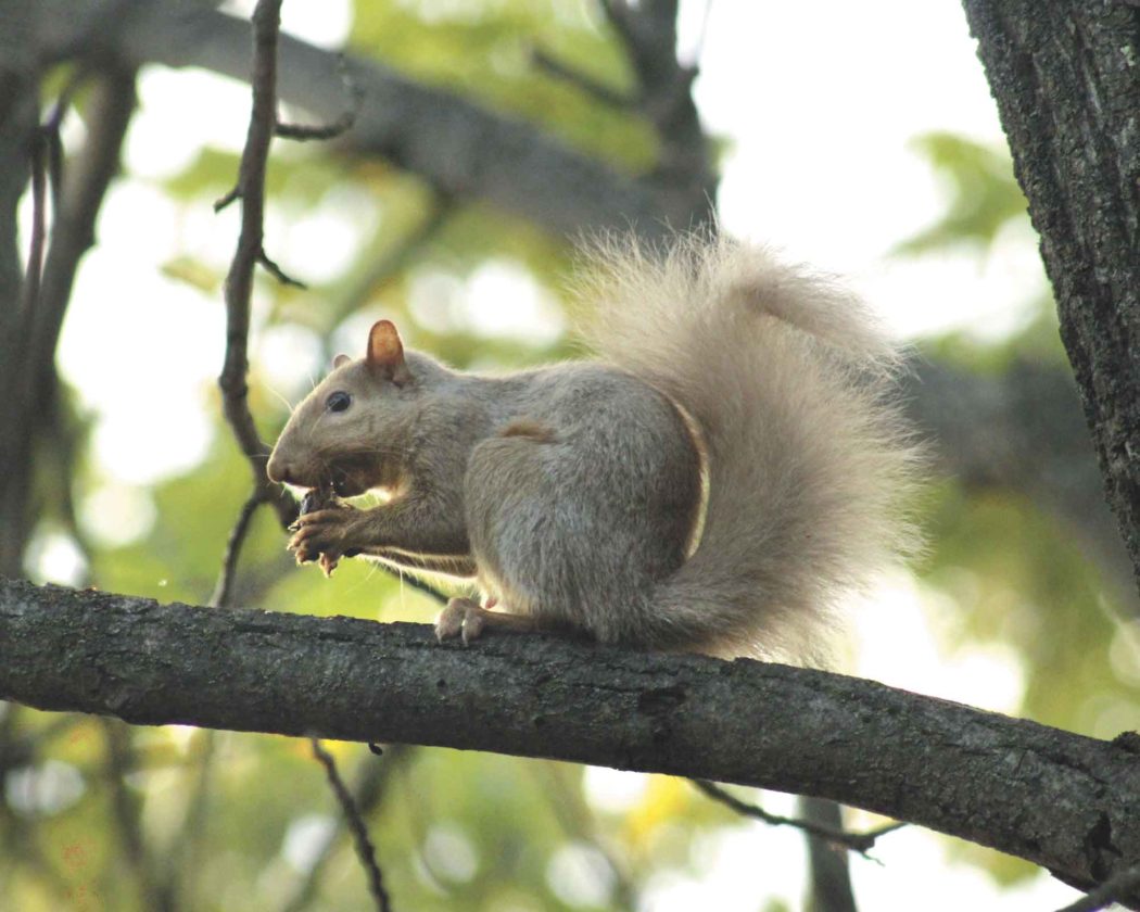 A squirrel eats a black walnut out of a tree on Iron Mountain’s east side. Several area residents have reported seeing the “blonde” squirrel in the area over the summer. It’s a gray squirrel with a white color morph. (Theresa Proudfit/Daily News Photo)