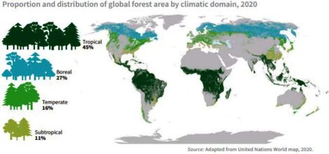 A MAP SHOWS boreal, temperate, tropical and subtropical forest geographic distribution.