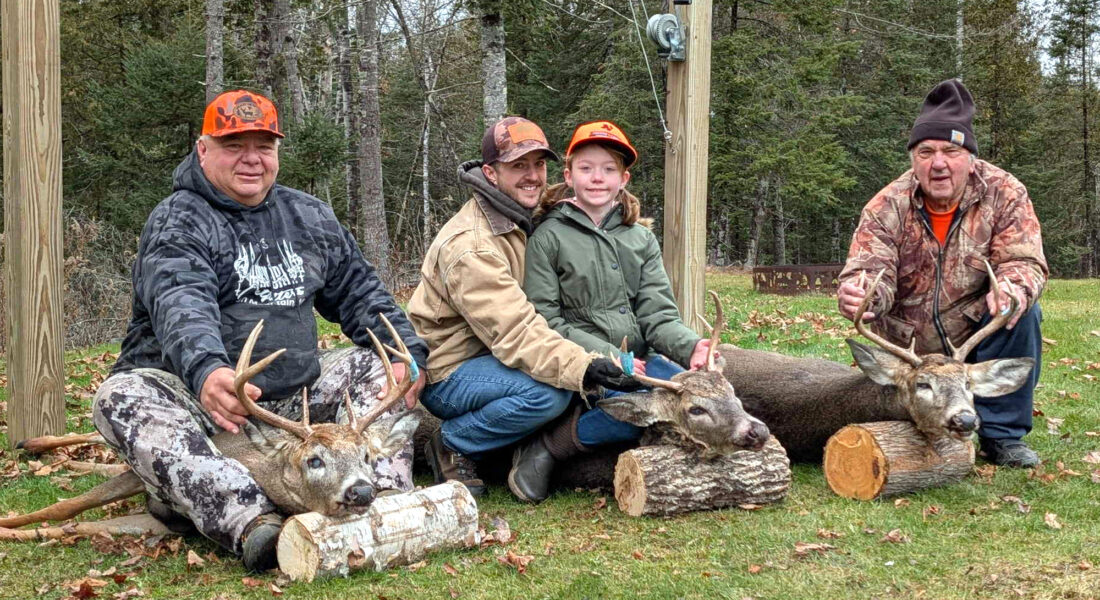 The Pollocks Paradise camp in southeastern Dickinson County found success through four generations of hunters this year. From left are Mark Zychowski of Vulcan, who got a nine-pointer on Nov. 16; Mike Mattas with 10-year-old daughter Amelia Mattas of Norway, who took her first buck Nov. 15 with her Christmas present, a 7mm-08 Ruger youth model; and Richard Zychowski, 89, of Norway, with a seven-pointer taken Nov. 15. (Courtesy photo)