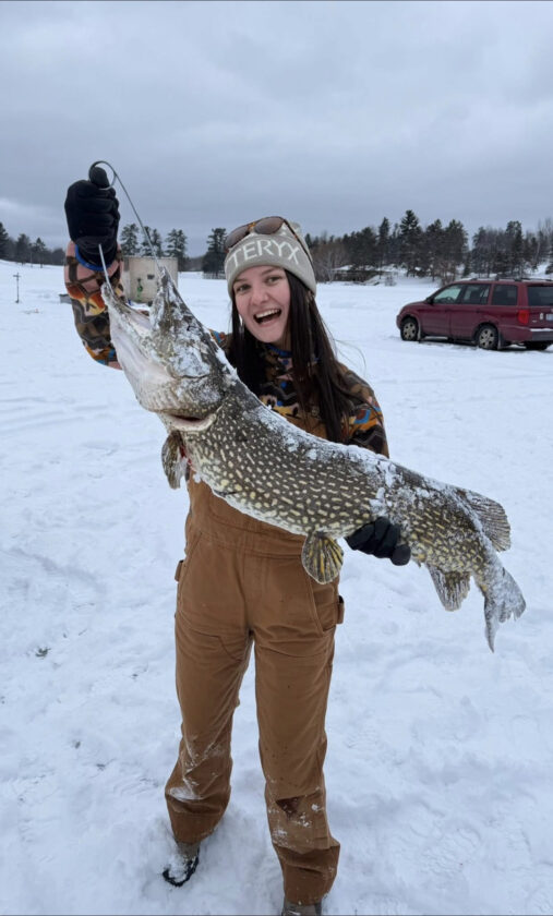 - Julia Brown of Homestead, Wis., took honors in the Pete “Toad” Church Ice Fishing Derby with a 38.5-inch northern pike. The annual “fish anywhere” tournament organized by the Homestead-Aurora Conservation Club coincides with free fishing weekend in Wisconsin. (Courtesy photo)
