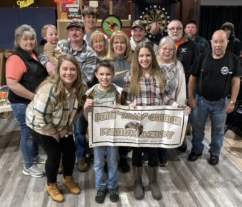 The Aurora-Homestead Conservation Club annually sponsors an ice fishing derby in memory of Pete “Toad” Church. Family members were on hand at the C&R Bar in Aurora on Jan. 17 to show their appreciation. From left, front, are Amanda Bartels, Weston Bartels, Kaylee Bartles; second row, Jackie Church, PJ Church, Peter Church, Linda Church, Fran Herman, Marilyn Vassar, Jon Church; back, Brayden Bartels, Dillon Church, Gerard Church, Brandon Church and Oliver Church. (Courtesy photo)