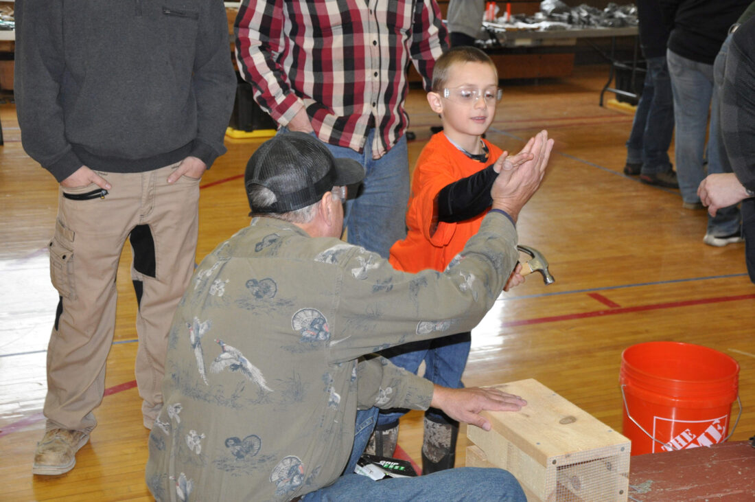Randy Johnsen gets a high five from a youngster at the 2025 U.P. Trappers workshop at the Hermansville Community Center for helping him build his own mink box. This year’s event is Saturday, Feb. 7. (Mike Lewis photo)