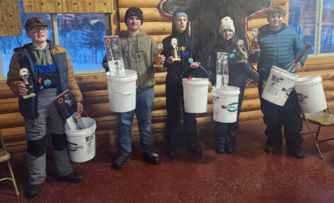 Youth category winners at Tip-UP Town of the U.P. included from left, Corbin Mattson (crappie), Jason Harwath (perch), Jack Cvengros (walleye), Ella Kasten (northern pike) and Graham Hartwig (bluegill).