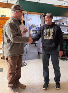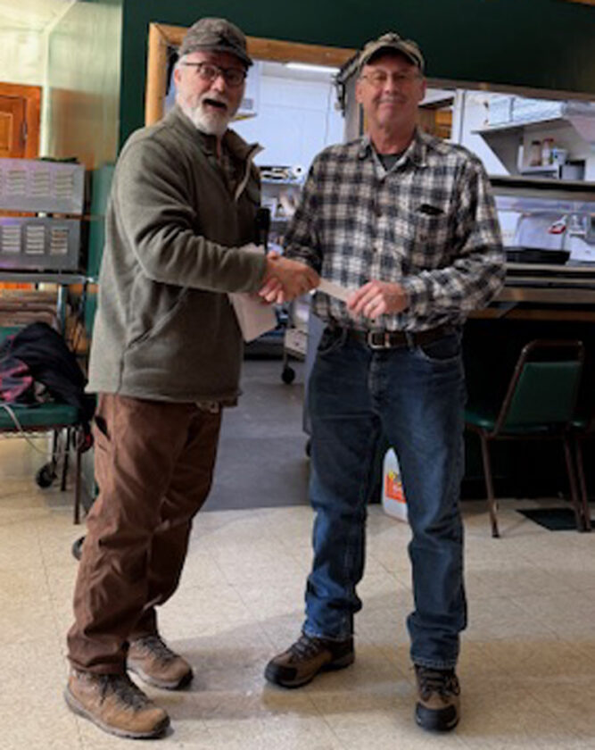 Goodman-Armstrong Creek Lions Club member Todd Kowalkowski congratulates Matt Carothers, who was first place caller and harvested the biggest predator. (Courtesy photos)